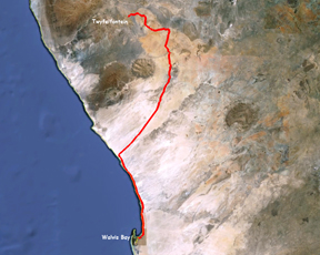 En s’enfonçant dans les terres depuis la Skeleton Coast, le paysage traverse d’abords les dunes, avant de rejoindre un désert de montagnes, pour finir sur les hauts plateaux du centre de la Namibie. |