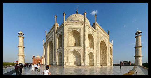 Posé sur son socle, haut de 60 mètres, le Taj Mahal de marbre blanc est entouré à l’Ouest par la mosquée, et à l’Est par le Naqqar Khana (maison d’hôtes) construit à l’identique. |