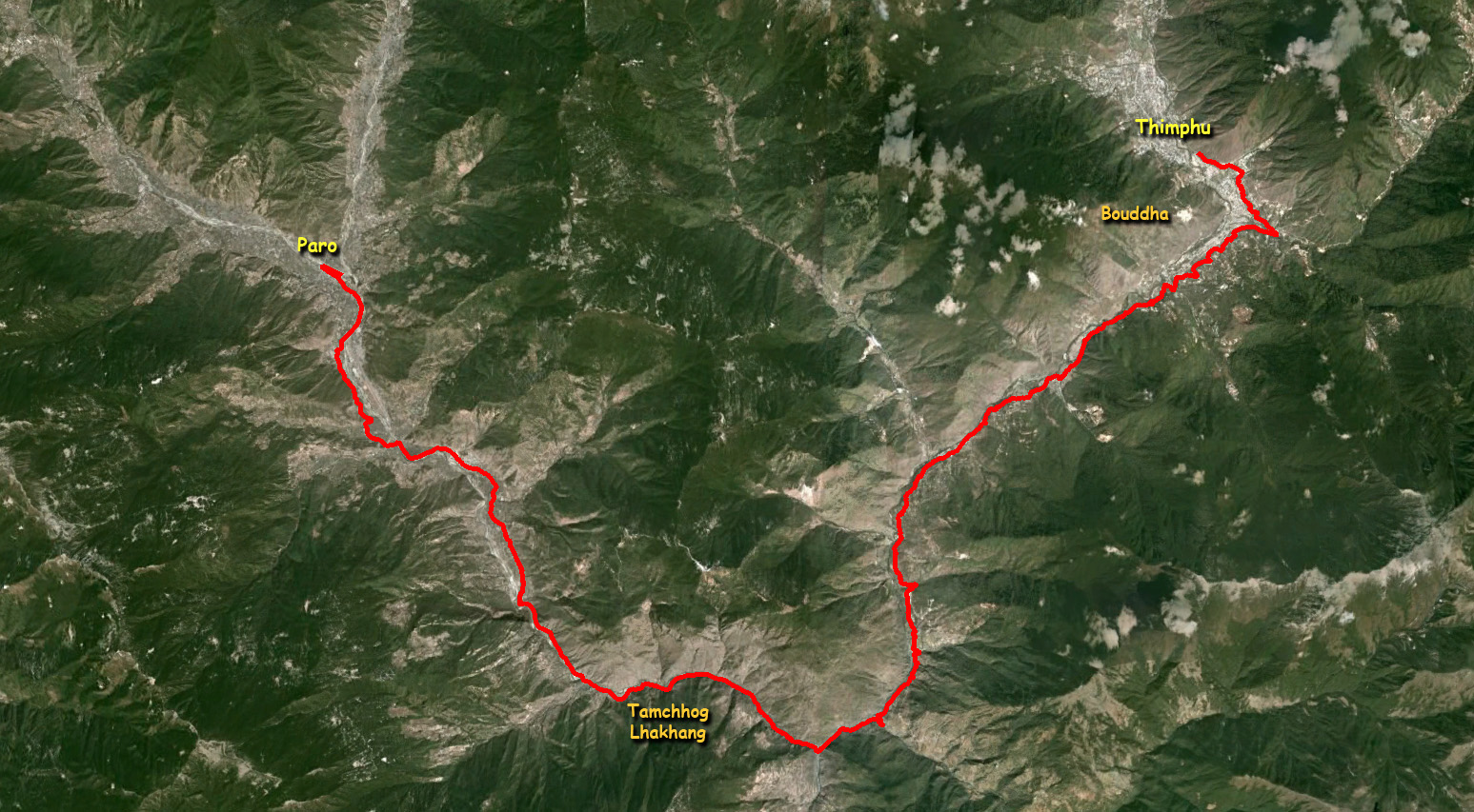 Sur la route de Paro à Thimphu se trouve le Tamchhog lhakhang appartenant à des descendants du fameux constructeur de ponts tibétains Thangtong Gyalpo (1385-1464). Il est considéré comme le premier à avoir utilisé de lourdes chaines de fer pour la réalisation de nombreux ponts suspendus. En 1433, il vint au Bhoutan en quête de minerai de fer et y construisit 8 ponts de Paro à Trashigang. |