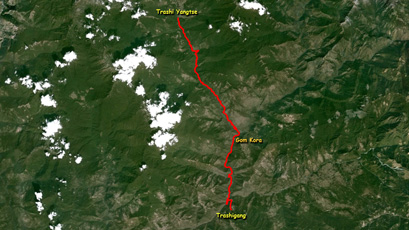 Construite sur un éperon et adossée à la montagne, Trashigang domine la vallée de la Drangme Chhu. Malgré sa taille modeste, Trashigang est la plus grande bourgade des montagnes bhoutanaises derrière Thimphu. |