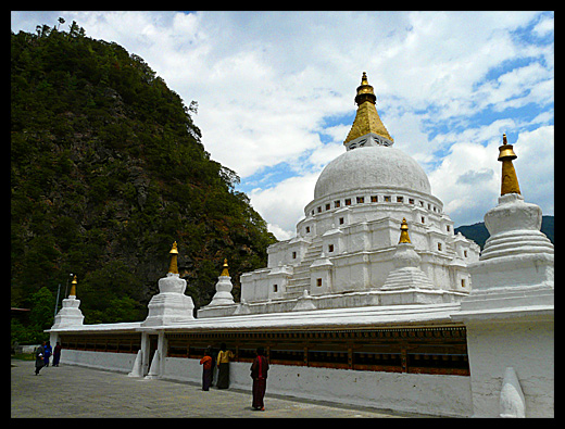 Omniprésent au Bhoutan, les chorten représentent l’esprit du Bouddha. Les 8 principaux ont chacun un détail qui les caractérise et symbolise chacun une étape de la vie du Bouddha. |