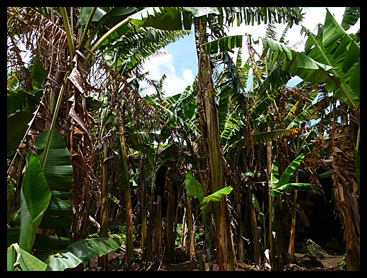 A l’abri du vent et profitant de l’humidité ambiante, des plantes telles que des bananiers ont pu se développer. |