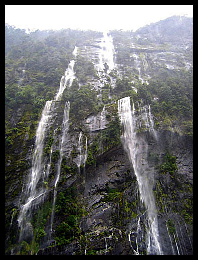 La pluie incessante de la région crée de nombreuses chutes d’eau temporaires qui dévalent les parois abruptes du fjord. |