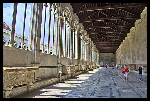 La légende raconte que la terre du champ sacré (Composanto) situé au milieu de l’édifice viendrait du Golgotha, rapportée par les croisés au début du XIIIème siècle. On la prétendait capable de décomposer un corps en quelques jours pour ne laisser que le squelette. |