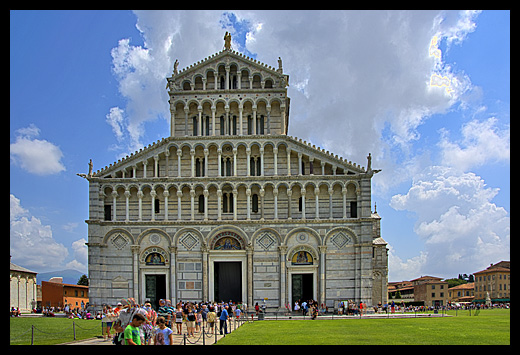 Sur sa façade richement décorée de colonnades et d’ornements de type arabo-byzantin se trouve également encastré le tombeau de Buscheto. |