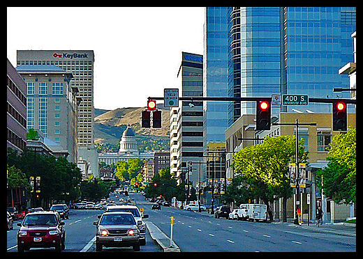Créée en 1847 par un petit groupe de pionniers mormons, la ville de Salt Lake City est construite sur un système de quadrillage régulier caractéristique des cités mormones. Parmi les larges avenues qui découpent la ville, State Street aboutit au niveau de l’Utah State Capitol au Nord de la ville. |