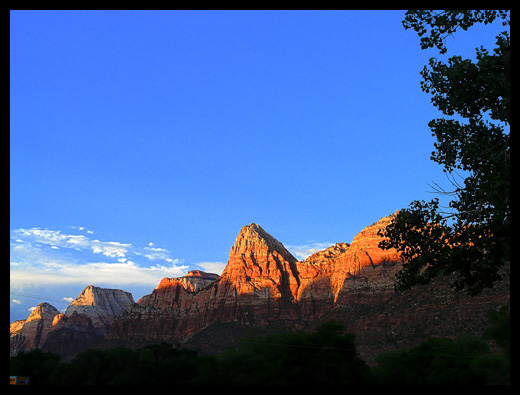 Traversé par la North Fork Virgin River, la particularité du canyon de Zion réside dans ses hautes parois de grès rougeâtre aux cimes blanchies. |